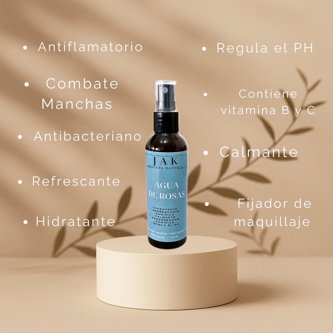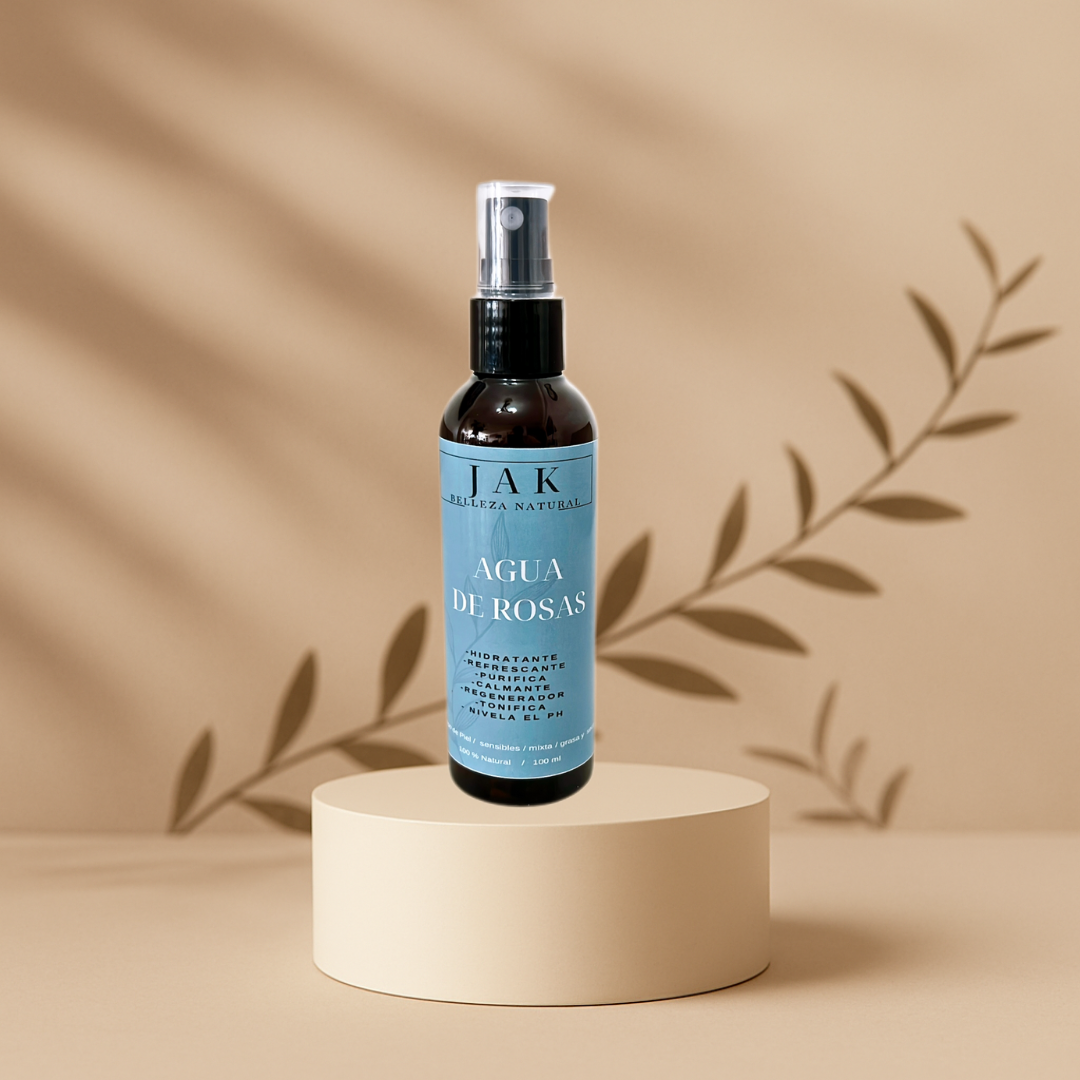 Con propiedades hidratantes y antioxidantes, el agua de rosas ayuda a equilibrar el pH de la piel, dejándola suave, luminosa y rejuvenecida.